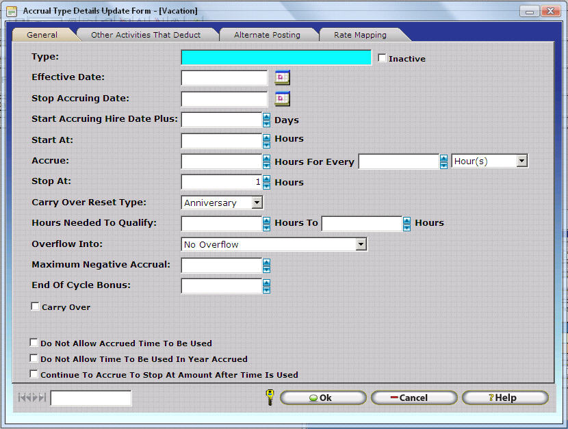 Stop At Amount: Enter the maximum amount of time an employee can accrue. Once this level has been reached, no further time will be accrued.