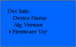 d. The Dev Info menu will be displayed. Press the down arrow until you see Device Name. Ensure the arrow points to Dev Info and press OK to show the Device Name.