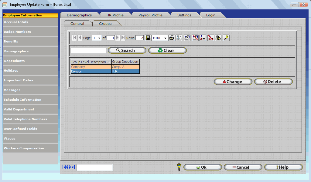 The Groups tab will display all available Groups that an employee can be assigned to. Assigning employees to groups provides additional options for report filtering. To assign a group description to an employee simply click on the drop down box and select the group you wish to assign to the employee. To remove an employee from a group click the delete button.