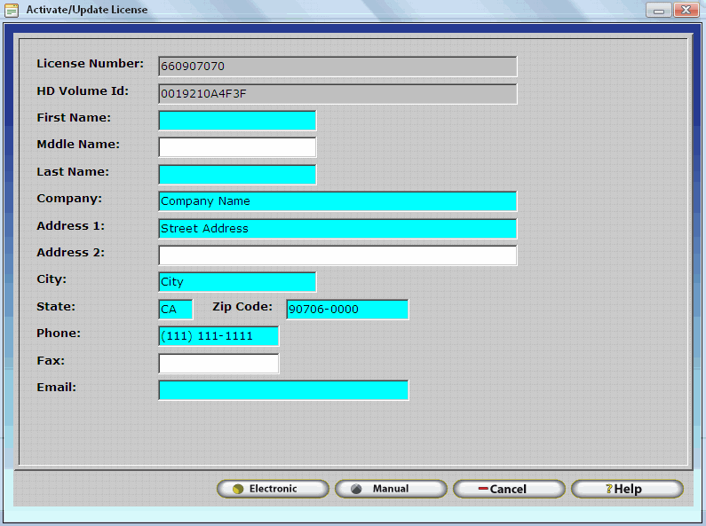 Ensure all required fields on the Activate / Update License form are filled with current contact information. Required Fields include First Name, Last Name, Company Name, Address 1, City, State, Zip Code, Phone Number, and Email.
