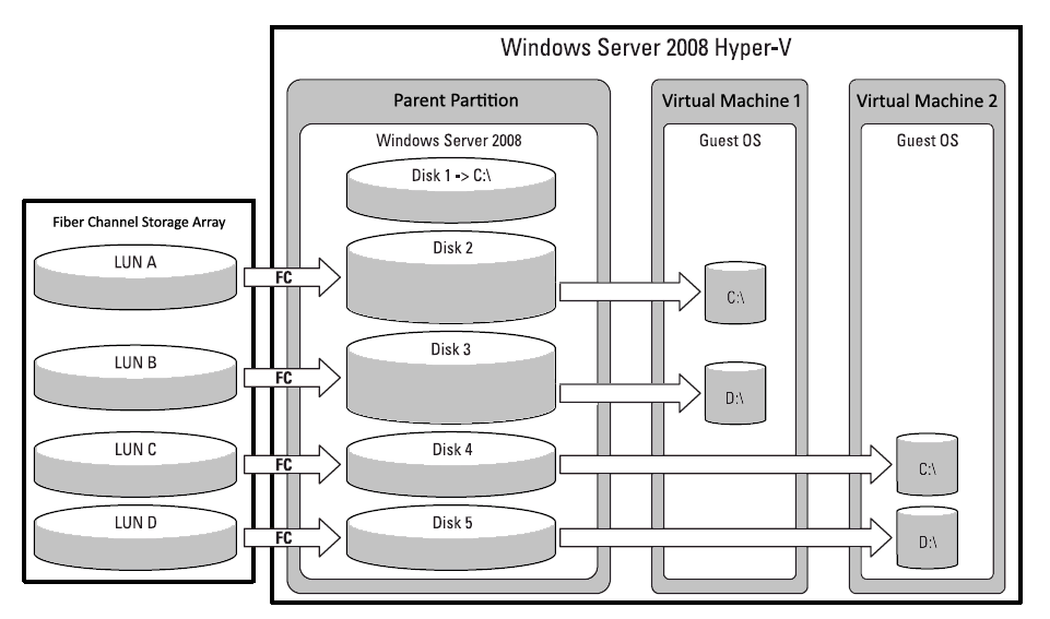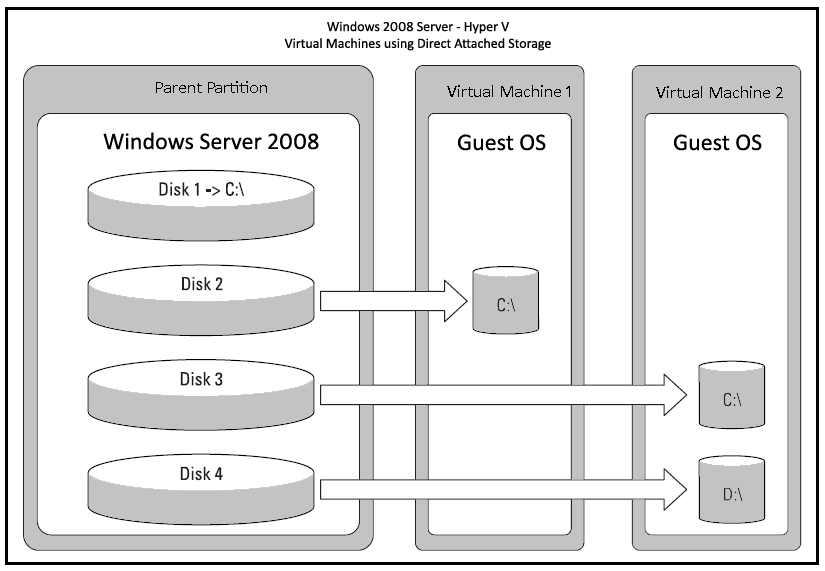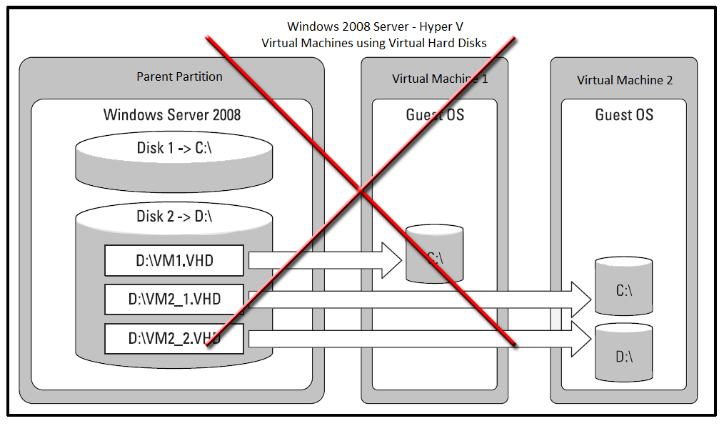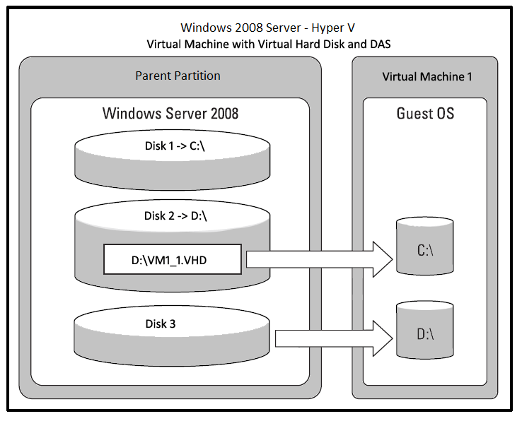 To clarify, the Operating System of the Virtual Machine may be installed using physical storage (DAS or SAN) or a virtual hard disk (VHD). Regardless of how the Operating System of the Virtual Machine is installed, physical storage must be made available for and selected during installation of InfiniTime. Acceptable storage scenarios are depicted below.
