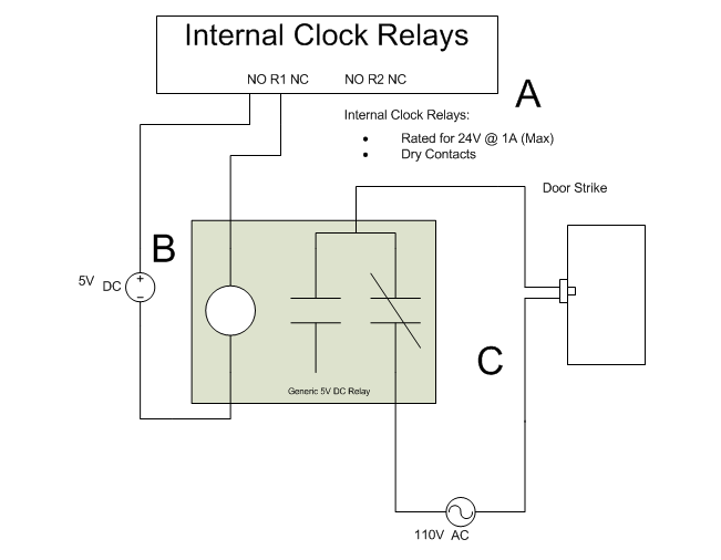 The Relay Contacts (C) provide the final connection between the door strike and a high voltage power source. It is important to keep in mind the electrical specifications for the Relay contacts when connecting a high voltage power source. The voltage and current rating of the relay contacts are dependant upon the relay's construction and model. Refer to the data sheet provided by the relay's manufacturer for this information. The circuit connected to the contacts of the relay should not exceed these voltage or current values. For your own safety, when wiring the door strike and power source into the relay contacts ensure the AC power source of the door strike and the DC power source used to energize the relay coil are turned off or unplugged. Standard procedure and safety guidelines dictate that all high voltage wiring must be safely enclosed. All measure must be taken to prevent inadvertent contact with an individual. Inception Technologies is not responsible for any damages or injuries incurred while attempting to design and wire customized circuitry for these devices. It is recommended a professional electrician perform these tasks.