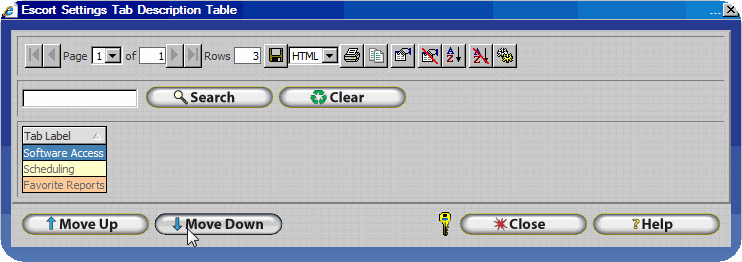 Reorder Tabs – Provides the ability to reorder previously created tabs. This option is only available when three or more tabs exist. If only two tabs exist clicking on this option will not open the Escort Settings Tab Description Table as shown below.
