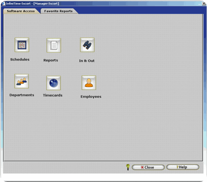Refer to the Client Access Section of the Installation Manual for instructions on accessing the InfiniTime Escort Module. At the Escort Module Login Window, employees may simply use their login ID and Password to access the Escort Module. The Escort Window assigned to the employee will then be displayed.