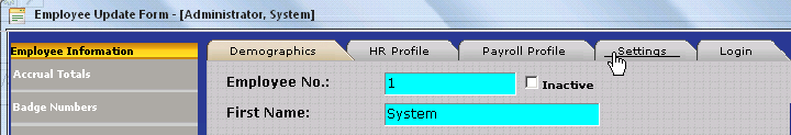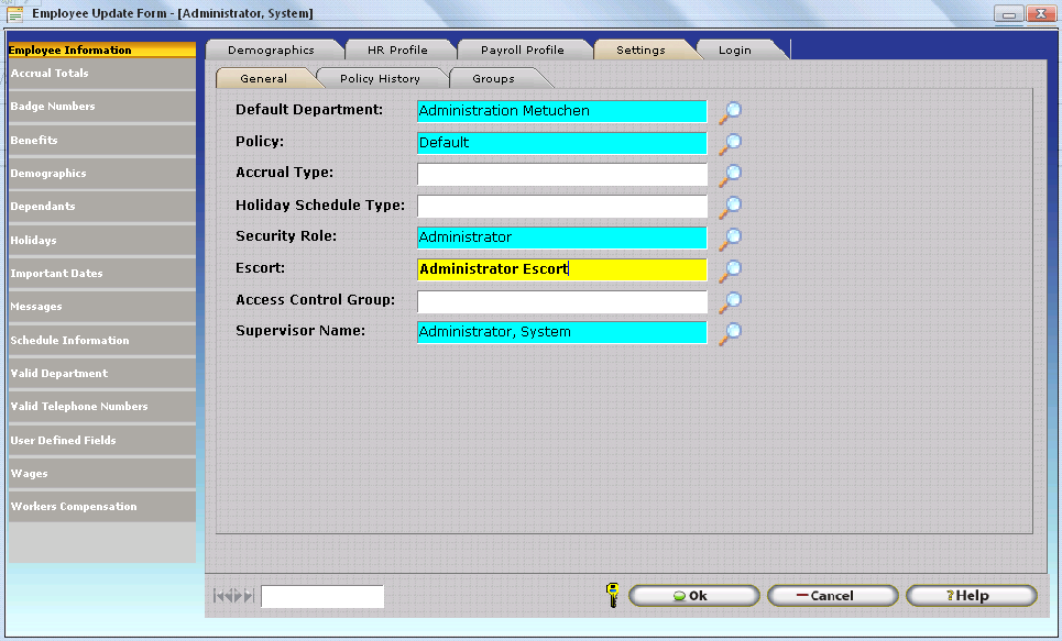 Escort Windows can be assigned to employees on the Settings Tab of the Demographics Section on the Employee Update Form. Instructions for assigning an escort window to an employee are provided below.