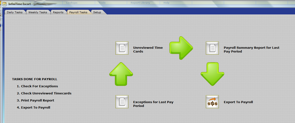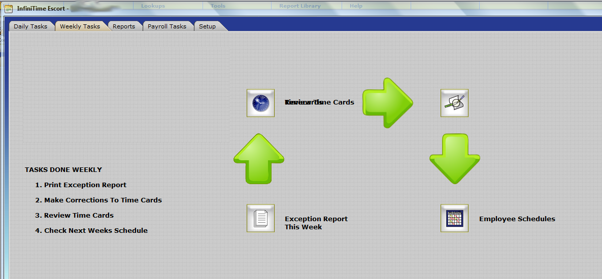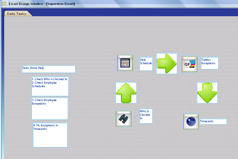 For example, using Escort Windows with clip art images and text labels can create a guided work flow for Daily Tasks, Weekly Tasks, and even Monthly or tasks related to a specific function such as Processing Payroll. An example Escort Window is provided below.
