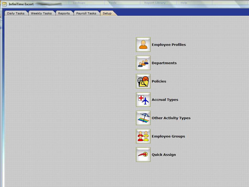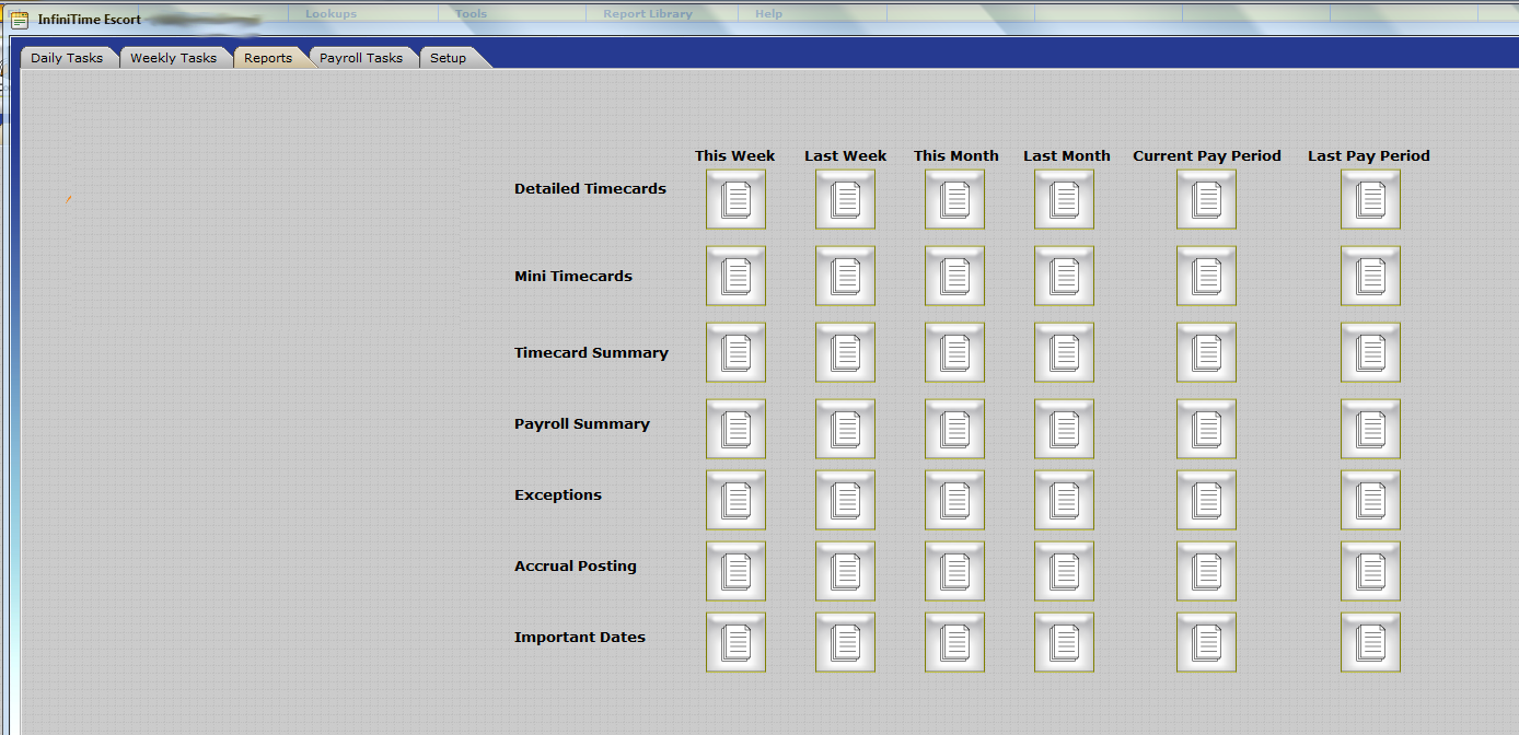 InfiniTime Escort allows the user to build a customized window with everyday tasks available at your fingertips in one place. An unlimited number of escort windows can be configured making it possible for each employee to have a customized portal to the InfiniTime Software Application if desired. In most cases, customers who choose to implement Escort will create one Escort Window for each set of employees responsible for specific tasks.