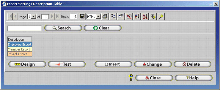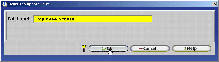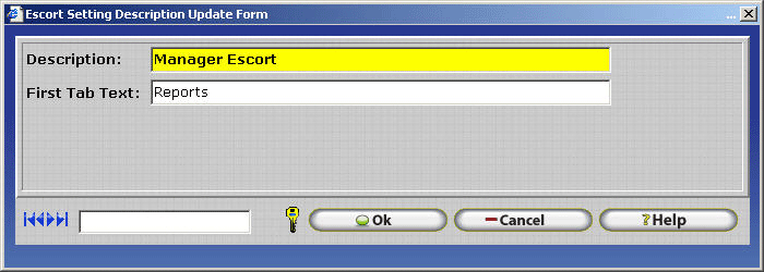 Change - Opens the Escort Setting Description Update Form for the Selected Escort. The user may then alter the Escort Description and first Tab Text as desired. The Escort Description is used to assign the Escort Window to individual employees.