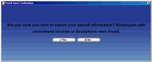 The Payroll Export includes four options which alert the user of specific conditions before Employee Hours and Earnings are exported to the Final Payroll Export File.