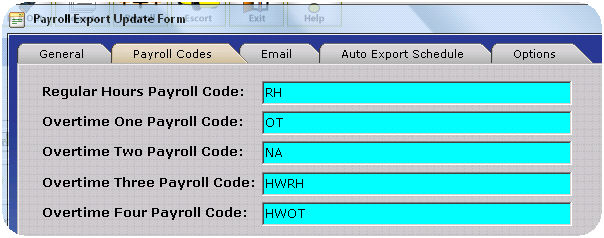 The Payroll Export Update Form displays Payroll Export related options and settings. Required settings have a blue background and must be completed before the Payroll Export can be saved.