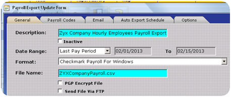The General Tab of the Payroll Export Update Form includes General and Output related options. General Options include the Payroll Export Description, Payroll Export Date Range, Payroll Export Employee Filter, and Payroll Export Format which define the payroll export and control the date range and set of employees for which hours and earnings will be exported. Output Options on the General Tab include the Payroll Export File Name, Send File via FTP, and PGP Encrypt File which control how the final Payroll export is distributed to interested parties such as internal staff or a third party company which will process payroll for your organization.