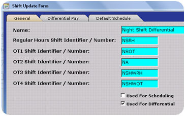 Shift Identifiers must be set on the General Tab of the Shift Update Form. One shift should be created for each Shift Differential.
