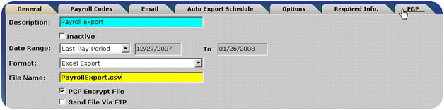 PGP Encryption is provided as an option to provide maximum security for sensitive information such as employee demographics, bank account details, and employee social security numbers. PGP Encryption can be enabled by Checking the ‘PGP Encrypt File’ Option on the General Tab of the Payroll Export Update Form. This enables the PGP Tab as shown below.