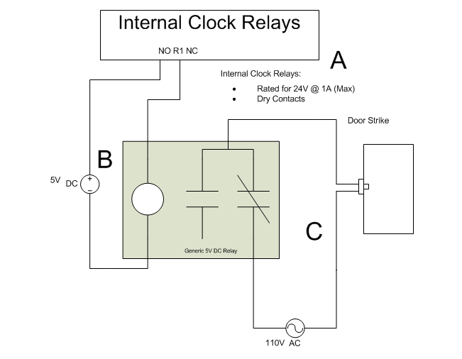The Relay Contacts (C) provide the final connection between the door strike and a high voltage power source. It is important to keep in mind the electrical specifications for the Relay contacts when connecting a high voltage power source. The voltage and current rating of the relay contacts are dependant upon the relay's construction and model. Refer to the data sheet provided by the relay's manufacturer for this information. The circuit connected to the contacts of the relay should not exceed these voltage or current values. For your own safety, when wiring the door strike and power source into the relay contacts ensure the AC power source of the door strike and the DC power source used to energize the relay coil are turned off or unplugged. Standard procedure and safety guidelines dictate that all high voltage wiring must be safely enclosed. All measures must be taken to prevent inadvertent electrical shock. Inception Technologies is not responsible for any damages or injuries incurred while attempting to design and wire customized circuitry for these devices. It is recommended a professional electrician perform these tasks.