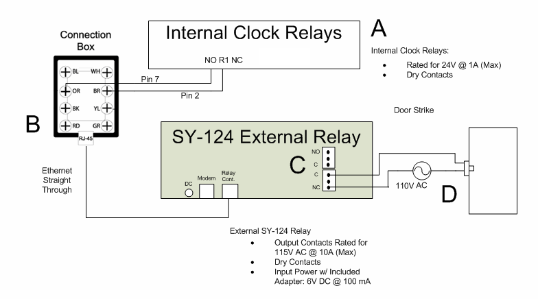 This diagram depicts the proper wiring of the SY-124 External Relay for use with an electronic door strike. The SY-124 External relay is intended for those who do not wish to design their own circuitry for use with an access control system. This diagram contains four major parts, the relay inside of the Atlast SY-777 (A), A connection box used to simplify the wiring (B), The SY-124 Relay Contacts (C), and the door strike with power adapter (D).