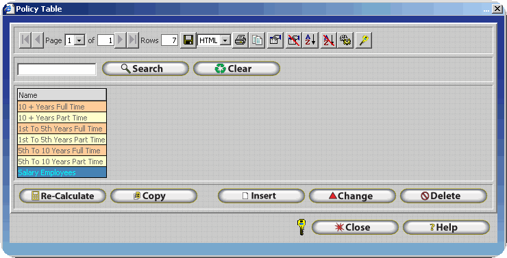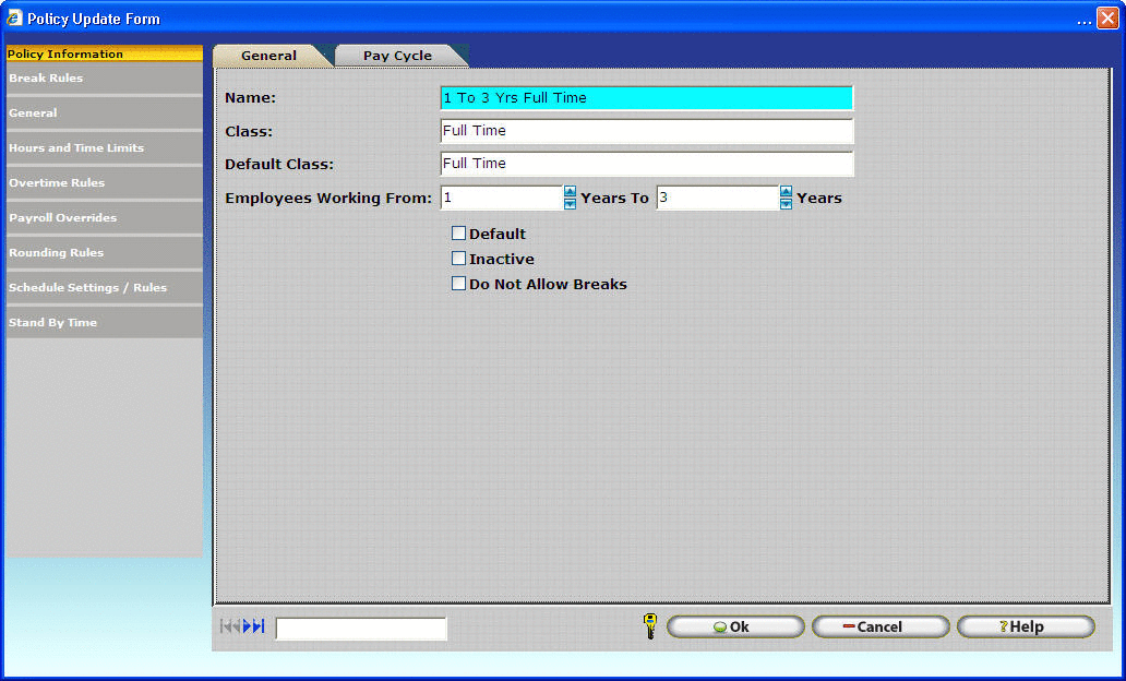 The table above shows the class and tenure configuration for all of the example companies policies. In this example there are three distinct policy groups. Full Time Employees, Part Time Employees, and Salary Employees represent the three categories of employees with different policy settings. As shown, it is often helpful to separate employees into categories with identical policy configurations in order to simplify the policy configuration process. Generally the easiest way to separate employees is according to pay type - Full Time, Part Time, and Salary. These categories usually have separate policy settings. Keep in mind if all employees within your company have the same policy settings it is not necessary to configure classes or tenures. Simply create one policy and configure it as appropriate. Once all classes have been identified the points at which policy settings change must then be chosen. In this example employees receive additional benefits after five and ten years of employment. With this in mind tenure ranges will be zero (0) to five (5) representing the policy for both full time and part time new hires, five (5) to ten (10) representing the policy for employees that have been with the company for more than five years be they full time or part time, and ten (10) to ninety-nine (99) representing full or part time employees that have been with the company for more than ten years.