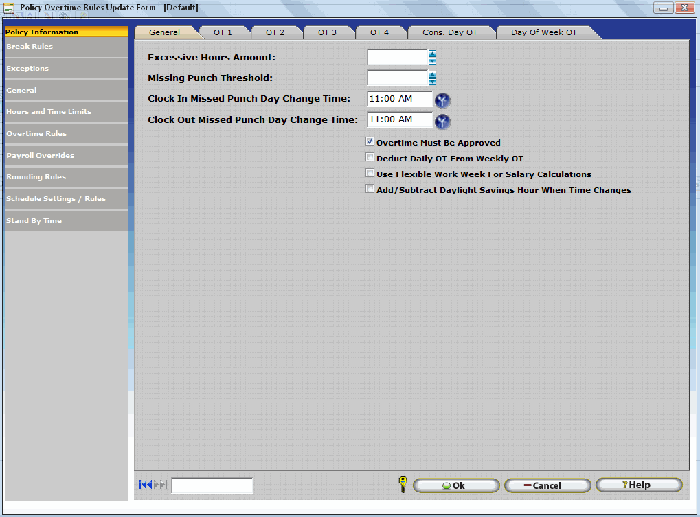 Use this to set overtime rules. You can set up to four overtime levels. Overtime Two settings must be higher than the Overtime One settings, etc. If you do not wish to calculate overtime on a daily or weekly basis, set fields equal to zero.