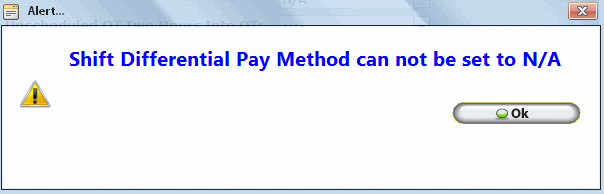 Shift Differential Pay Method – A Shift Differential Pay Method must be selected for employees to receive shift premiums. To ensure proper configuration, the Shift Differential pay method drop down is grayed out and cannot be set until a shift differential has been added to the Shift Differential Tab of the policy. As shown below, InfiniTime will warn the user if Shift Differentials are added to the policy and the Shift Differential Pay Method is not configured.