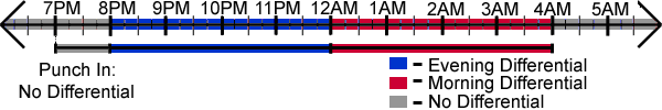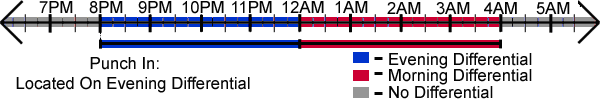 An RN is called in to work from 8PM to 4AM. The employee punches in at 8:00 PM, which is during the period defined by the Evening Differential. All eight hours (8PM to 4AM) will be paid at the Evening Differential rate.