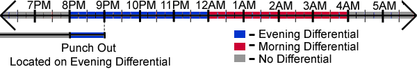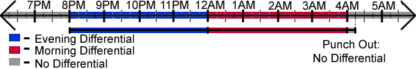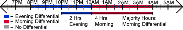 The diagram above illustrates an RN being called in to work from 10:00 PM to 4:00 AM. The majority of the worked hours fall within the Morning Differential. As such the employee receives the Morning Differential premium ($1.25) for all hours worked.